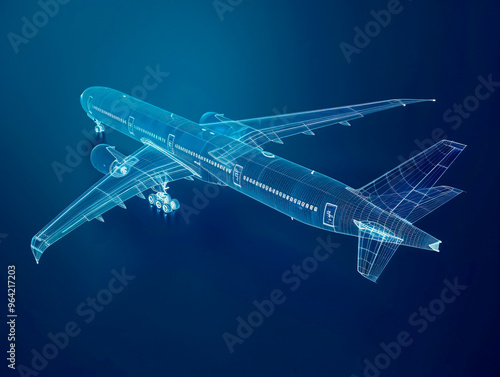 Augmented Reality Airplane Jet Engine Simulation. Advanced Industry Research and Development. Airplane visualization with augmented reality Transparent airplane in studio drawing in blue colors