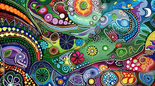 Australian Aboriginal dot art, featuring landscapes and symbols, intricate dots, wide angle shot, detailed and vibrant