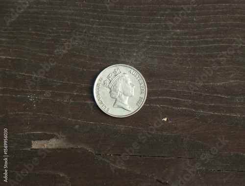 Australian coin on wooden table