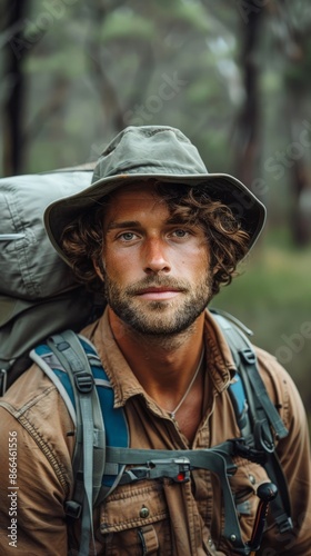 Australian man with hiking gear, looking adventurous