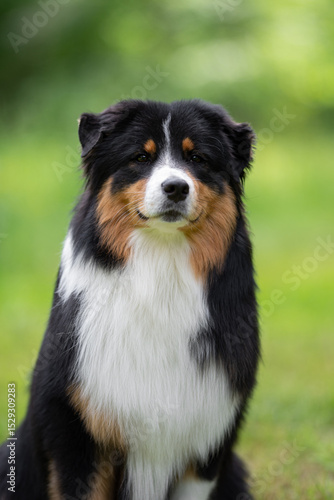 Australian Shepherd Dog with Shiny Black Coat and White Chest Posing Outdoors on a Sunny Day