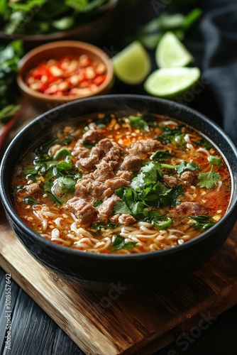 Authentic Kuay Tiew Nam - Thai Noodle Soup with Clear Broth & Flavors of Garlic, Chili, Lime. Traditional Thai Cuisine Specialty.