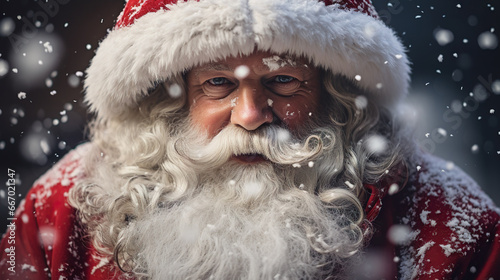 Authentic old Santa Claus at christmas with long white gray beard and red hat, snowflakes flying in xmas winter