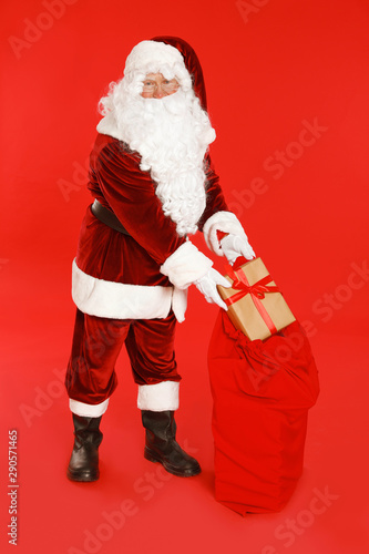 Authentic Santa Claus with sack and gift on red background