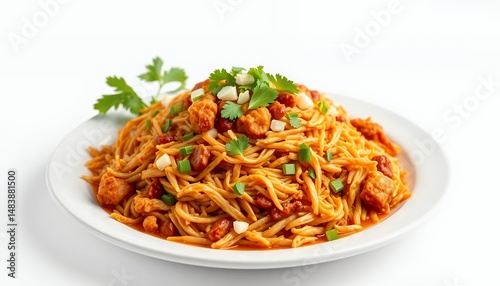 Authentic Zhajiangmian Noodles with Pork and Cilantro Isolated on White Background in Detailed 3D Rendering for Culinary Visualizations and Food Related Projects