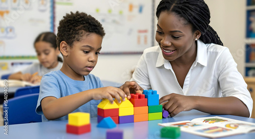 Autism, ADHD, Neurodiversity, Child, Therapy. Therapist supports focused boy building colorful block bridge during inclusive therapy session