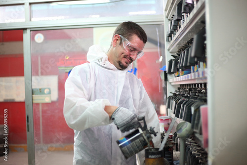 Auto mechanic working in garage. Repair service. Worker mechanics in uniform are working in auto service with lifted vehicle. Car repair maintenance.