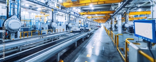 Automated car manufacturing assembly line. manufacturing plant with robotic arms and white car bodies in production illustrating industrial automation, banner
