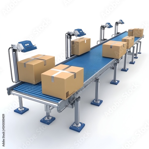 Automated conveyor belt system efficiently transports cardboard boxes through a modern warehouse distribution center.