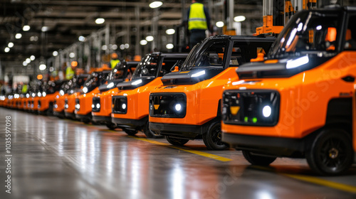 Automated industrial vehicles lined up in modern warehouse, showcasing advanced technology and efficiency in logistics. vibrant orange color adds dynamic touch to scene