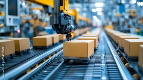 Automated robotic arm sorting and packaging boxes on a conveyor belt in a warehouse