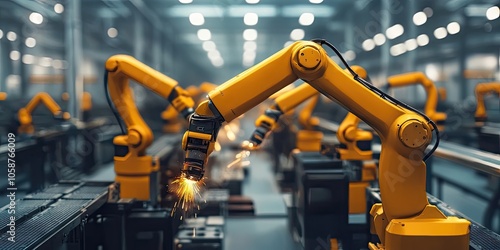 Automated robotic welding takes place in an industrial setting, where robots perform welding tasks to enhance efficiency and precision in manufacturing processes.