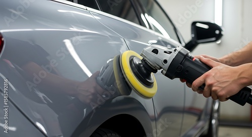 Automotive Paint Correction: Close-Up of a Person Using a Rotary Polisher to Buff the Side of a Modern Gray Vehicle, Enhancing its Shine