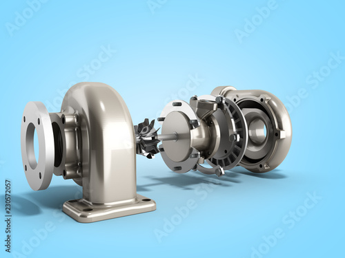 Automotive turbocharger turbine 3d render on blue