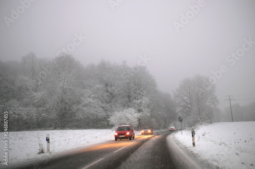 Autos im Schneetreiben auf glatter Fahrbahn - Stockfoto