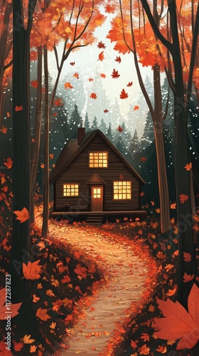 Autumn Cabin Path Illuminated By Warm Light