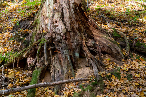 Autumn forest and colorful leaves are lying on the ground. Large tree trunks are scattered along the cleft of the deep forest. Bizarre shadows fall from trees in the forest during sunset.