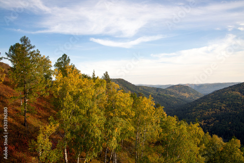 Autumn forest on mountain slopes under a blue sky with white clouds.