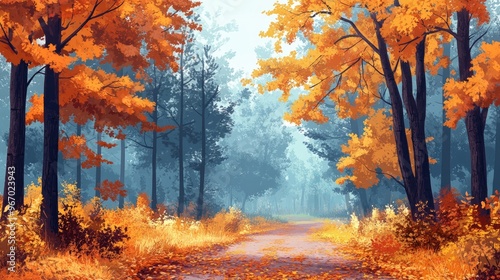 Autumn forest path covered in fallen leaves with fog