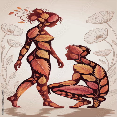 autumn, girl, nature, season, drawing, fall, boy, forest, harvest, graphic, cozy, colorful, orange, leaf, cartoon, vector, design, flat, happy, foliage, element, hand drawn, romantic, love, couple, ma