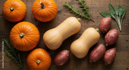 Autumn Harvest Still Life: Pumpkins, Butternut Squash, Sweet Potatoes, and Herbs on Rustic Wood