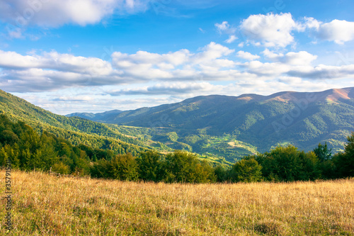 autumn landscape in evening light. trees and grass on the hillsside meadow. rural valley and mountain ridge in the distance beneath a blue sky with clouds