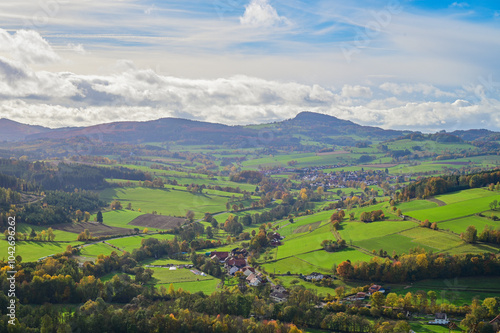 Autumn panoramic view of the beautiful landscape of the Hessian Rhön, with autumn forests, meadows and a small village near Hilders, autumn leaves, Hilders, Hesse, Germany