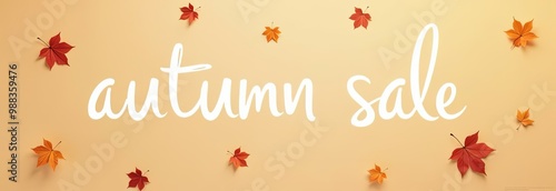 Autumn Sale lettering in white letters on a red background surrounded by falling leaves. Poster for the store, discounts in the store. Autumn shopping concept.