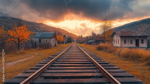 Autumn sunset over railroad tracks leading to abandoned houses in a mountain valley.