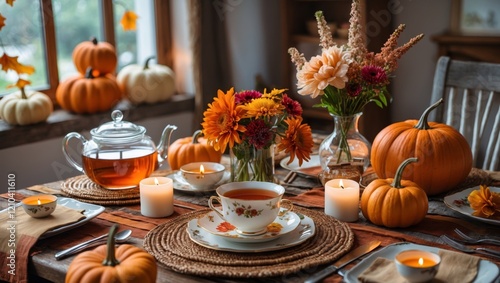 Autumn table setting with tea pumpkins and flowers