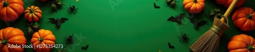Autumnal flat lay of black bats, spiders, and glowing pumpkins on a green background, broom, pumpkins, bats