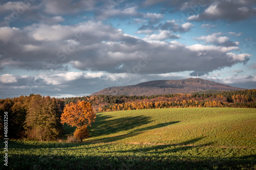 Autumnal landscape with Sleza Mountain, Poland. Blue, cloudy sky. Colorful foliage on the trees.
