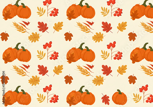 Autumnal Pattern with Pumpkins Leaves and Berries.