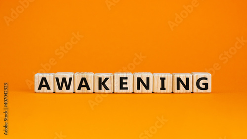 Awakening symbol. Wooden cubes with the word 'awakening'. Beautiful orange background, copy space. Business and awakening concept.