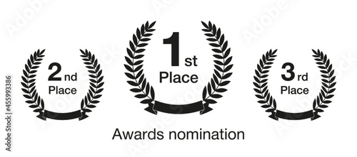 Awards logotype set. First, second, third place symbol. Decorative congrats. Tradition greeting. Round palm. Cup elements.