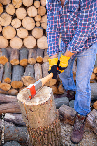 Ax in hand. Man holding an industrial ax. A strong man holds an ax in his hands against the background of firewood. Strong man lumberjack with an ax in his hand.