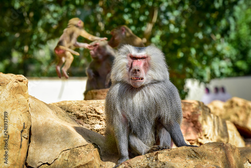 Baboon sitting on the rocks in the park.