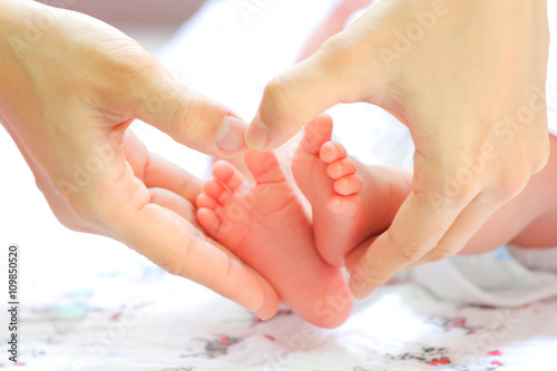 baby feet in mother hands. Happy Family concept. Tiny Newborn Ba