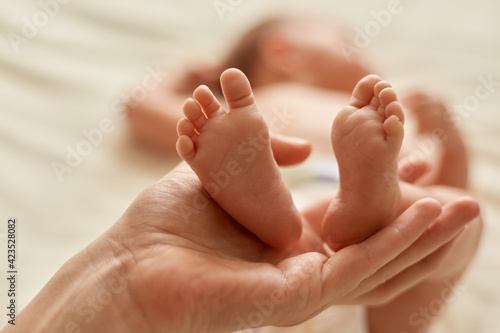 Baby feet in mother hands. Tiny newborn baby's feet on female hands. Mom and her child, mommy doing massage for infant, Beautiful image of maternity.