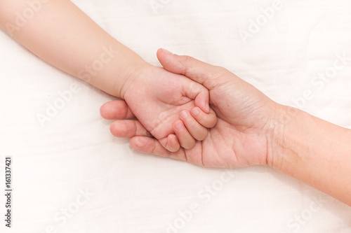 Baby life in mother hand. Mom take care of baby. Hand of baby in hands of parents.