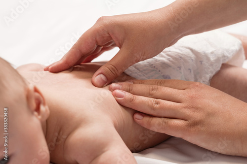 baby massage, close-up hands on baby back