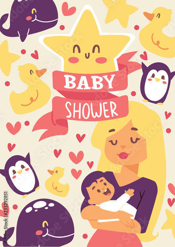 Baby shower vector illustration. Mother holding her little baby. Smiling mom with cheerful kid. Cute duck, star, whale,penguin. Banner, poster, invitations greeting card.