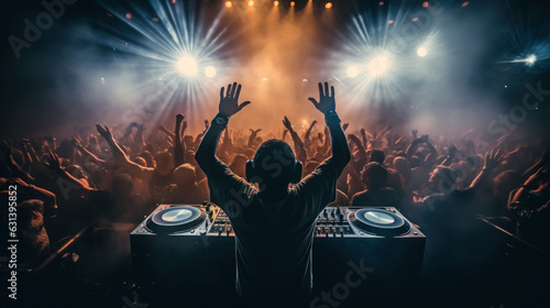 Back of DJ turntable with hands raised at crowded concert with color lighting