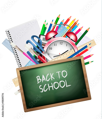 Back to school. Background with colorful supplies. Vector