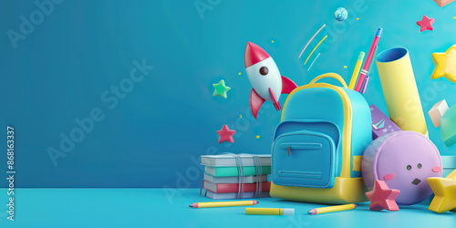 back to school banner with copy space, cute school tools and books