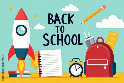 Back to school concept with rocket, backpack, and school supplies in a playful design.