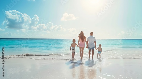 Back view of a beautiful family on a beach during summer vacation Wide panorama perfect for banners : Generative AI