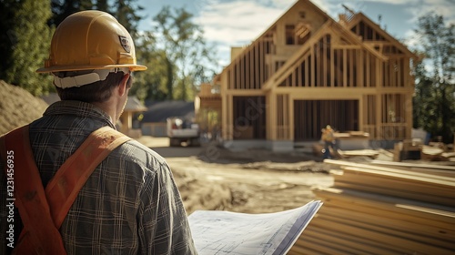 Back View of Construction Worker Overseeing Home Building Project with Blueprints