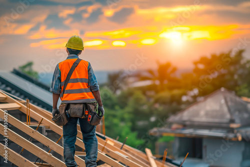 Back view of construction worker wearing safety uniform during working on roof structure of building on construction site.