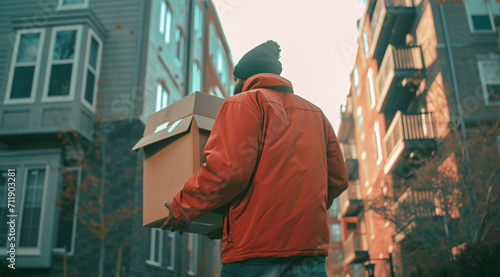 Back view of Delivery man courier delivering cardboard box package in winter.